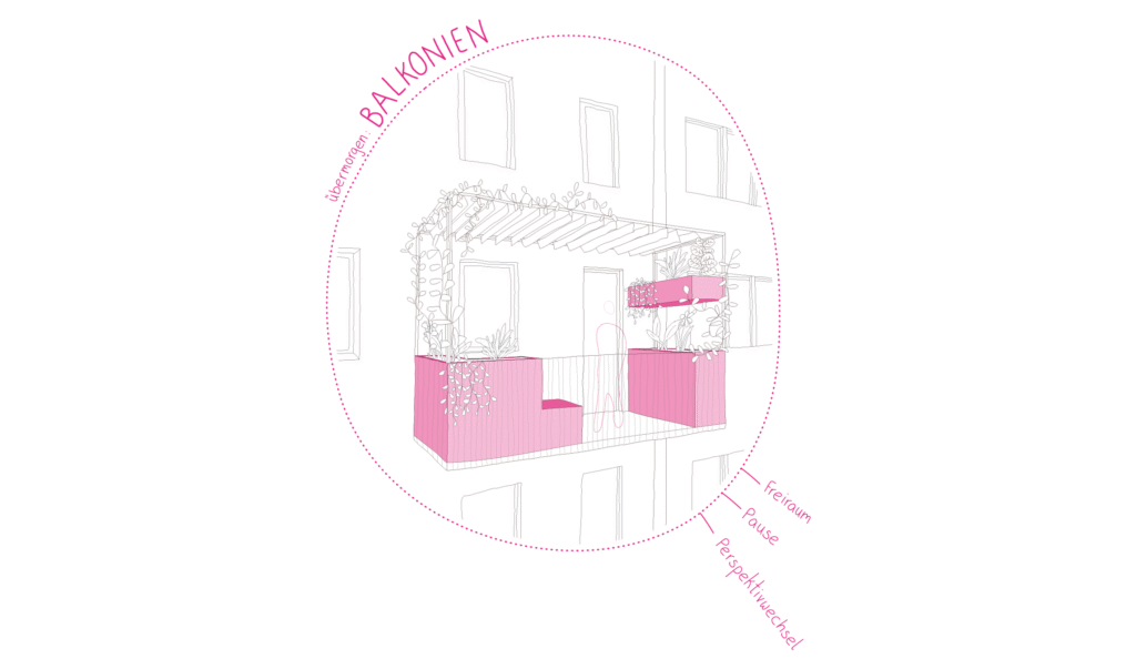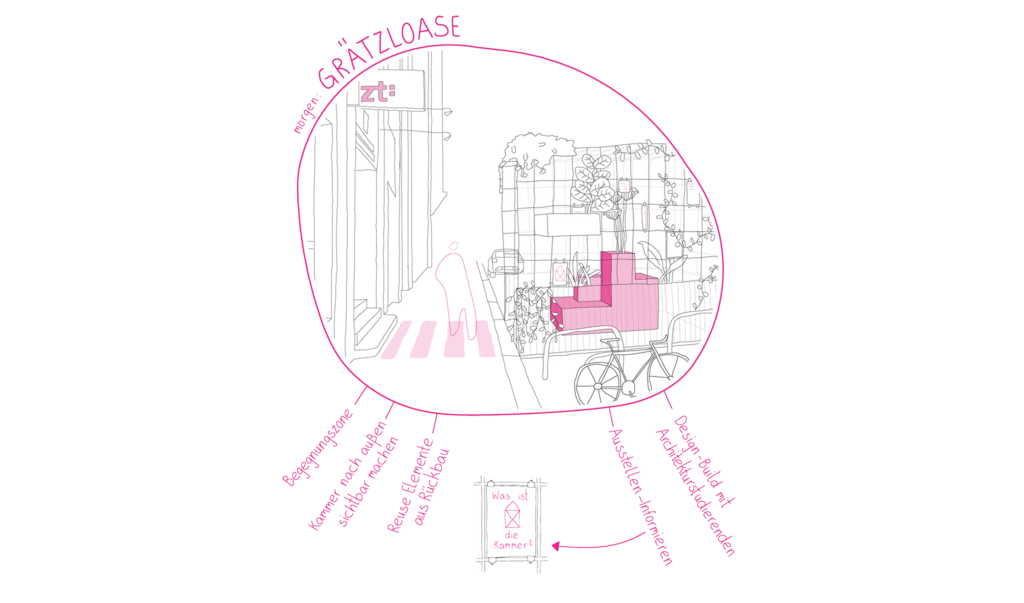 Unser Konzept für den Büroumbau in der Karlsgasse 9/10 gliedert sich in drei Phasen: Heute wird der Innenraum des Büros zukunftsfähig gemacht. Morgen entsteht vor dem Eingang eine Grätzloase, die mit Materialien aus dem Rückbau der Büroräume von Architekturstudierenden der TU Wien umgesetzt wird, um den Wiener:Innen die Arbeit der ZT-Kammer näherzubringen. Übermorgen folgt die Ergänzung eines hofseitigen Balkons, um die Bürofläche um einen Freiraum zu erweitern.