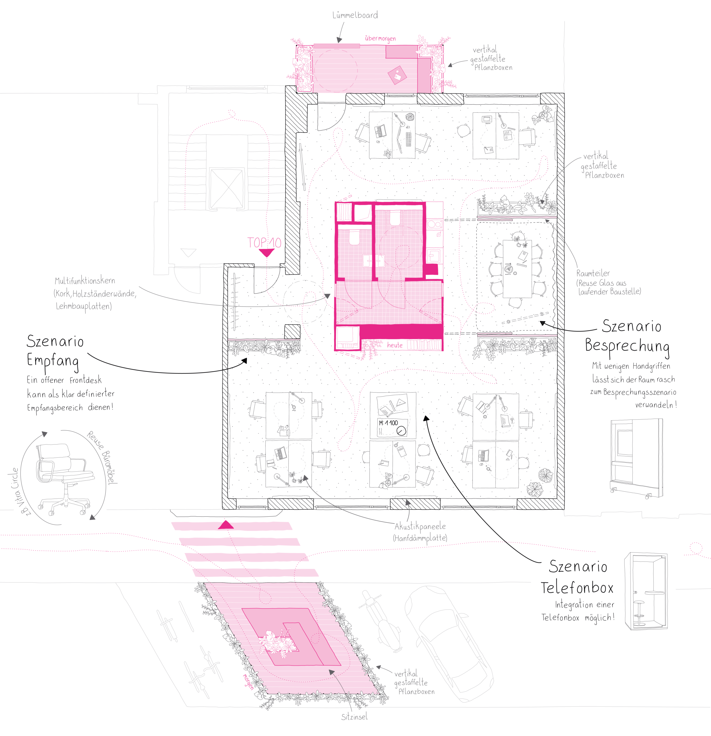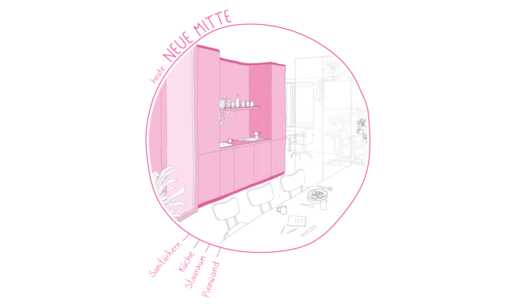 Im „Heute“ liegt der Fokus auf zwei flexibel nutzbaren, gut belichteten Bürobereichen, die durch einen zentralen Funktionskern mit Küche, Sanitär, Technik, Stauraum und einem vielseitig nutzbaren „Extrazimmer“ gegliedert sind. Durch die offene Zonierung, verschiebbare Raumteiler und mobile Möblierungselemente lässt sich die Bürofläche flexibel an einen Wechsel der Nutzungen anpassen.