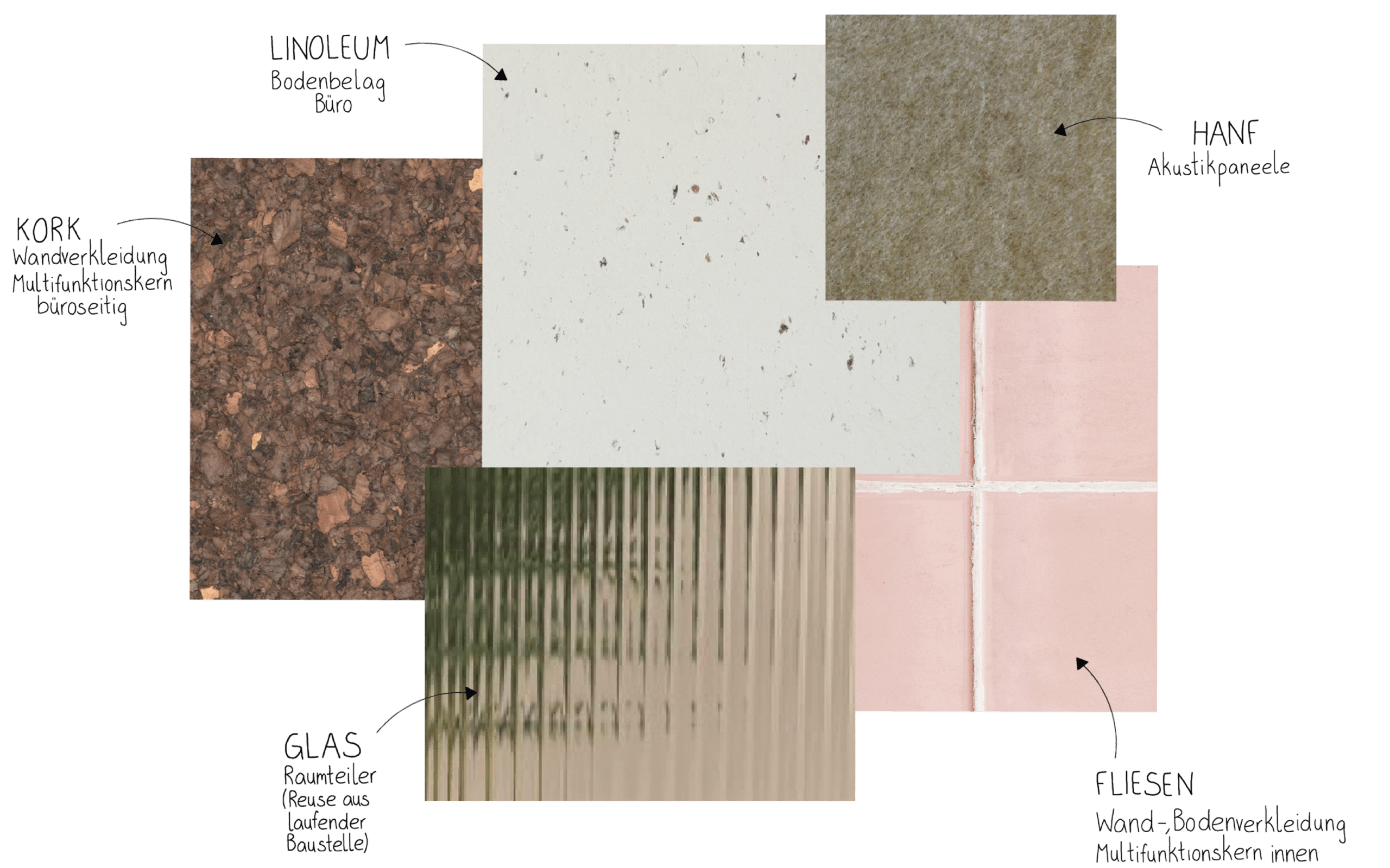 … Die Materialwahl orientiert sich an Natürlichkeit und Nachhaltigkeit: Der zentrale Funktionskern ist büroseitig mit Kork verkleidet, wirkt akustisch dämpfend und dient gleichzeitig als Pinnwand und Informationsträger. Bestehend aus Holzständerwänden mit Lehmbauplatten statt konventioneller Bauweise aus Gipskarton und Stahlblech, überrascht er im Inneren: Ein lebendiges Pink kleidet Wände und Decke vollständig in cradle-to-cradle-zertifizierten Fliesen. Ergänzt wird das Konzept durch langlebigen Linoleumbelag im gesamten Bürobereich sowie durch Paneele aus Hanf, die akustische und atmosphärische Qualität schaffen.